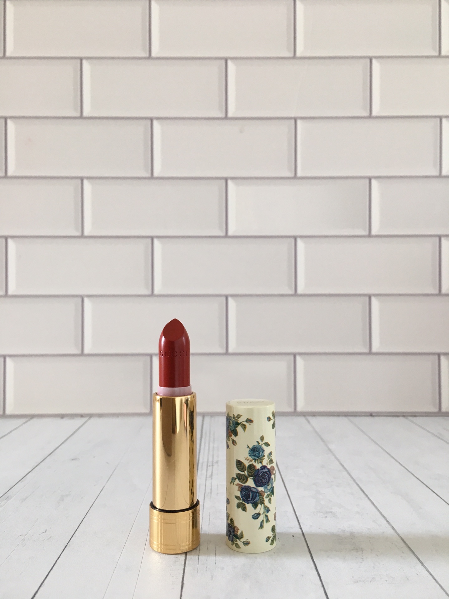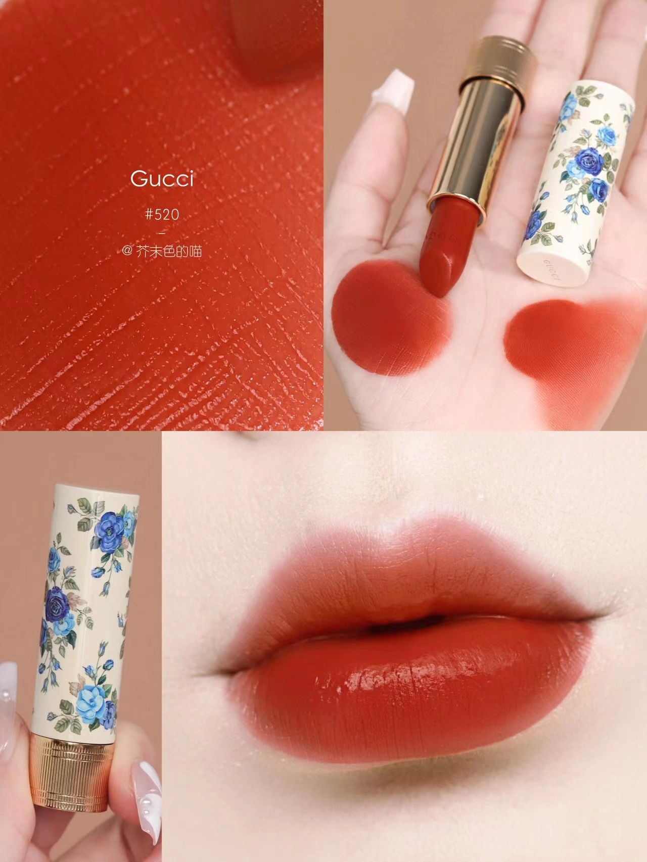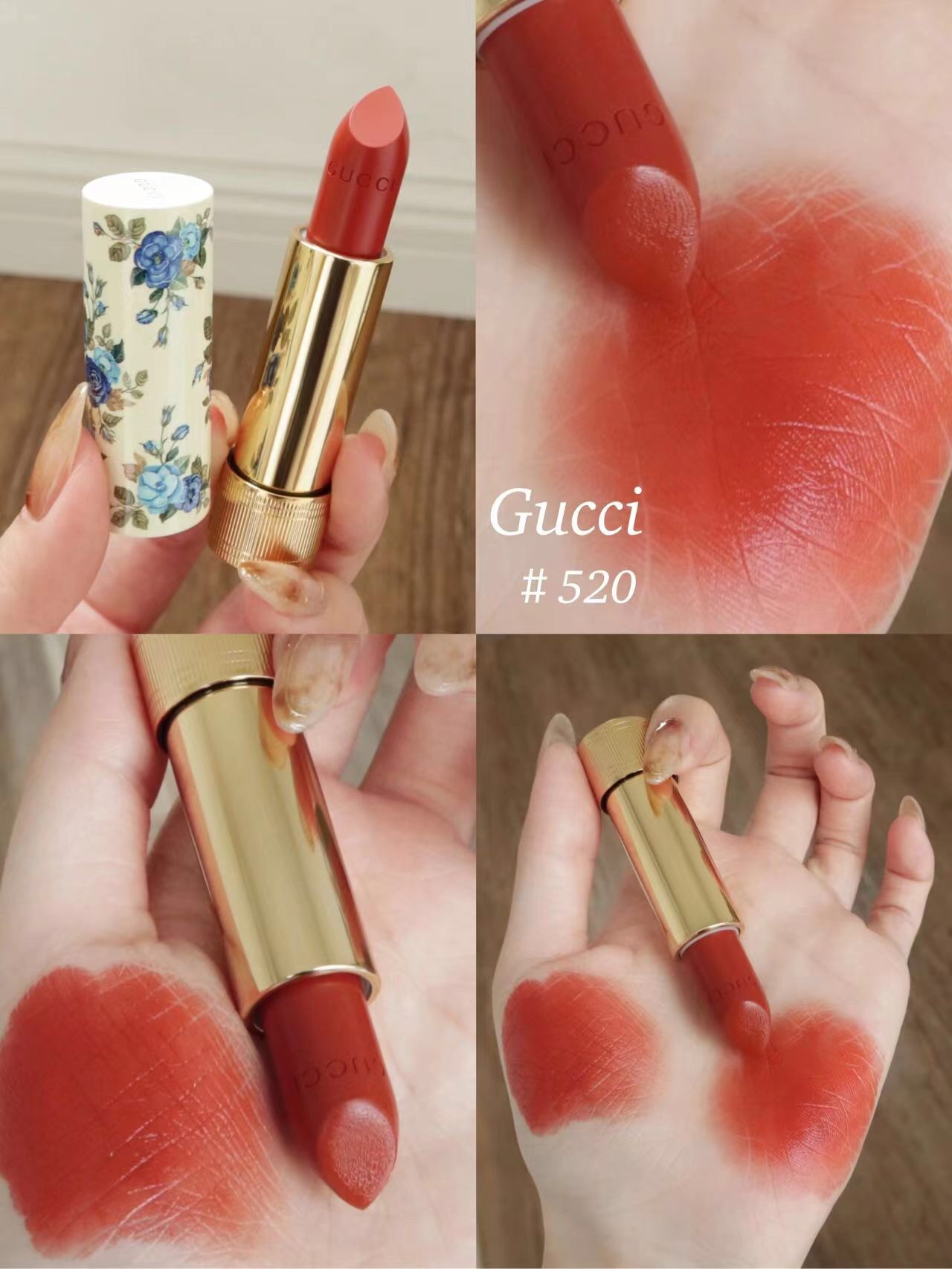 Indulge in Gucci's limited edition lipstick featuring a vintage blue floral design. Shade 520 offers a blend of red and brown for everyday wear.