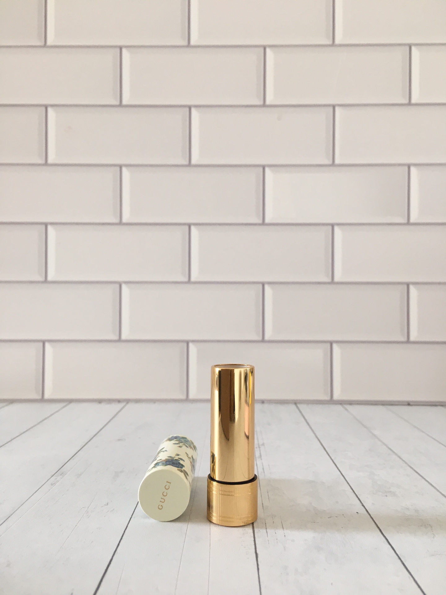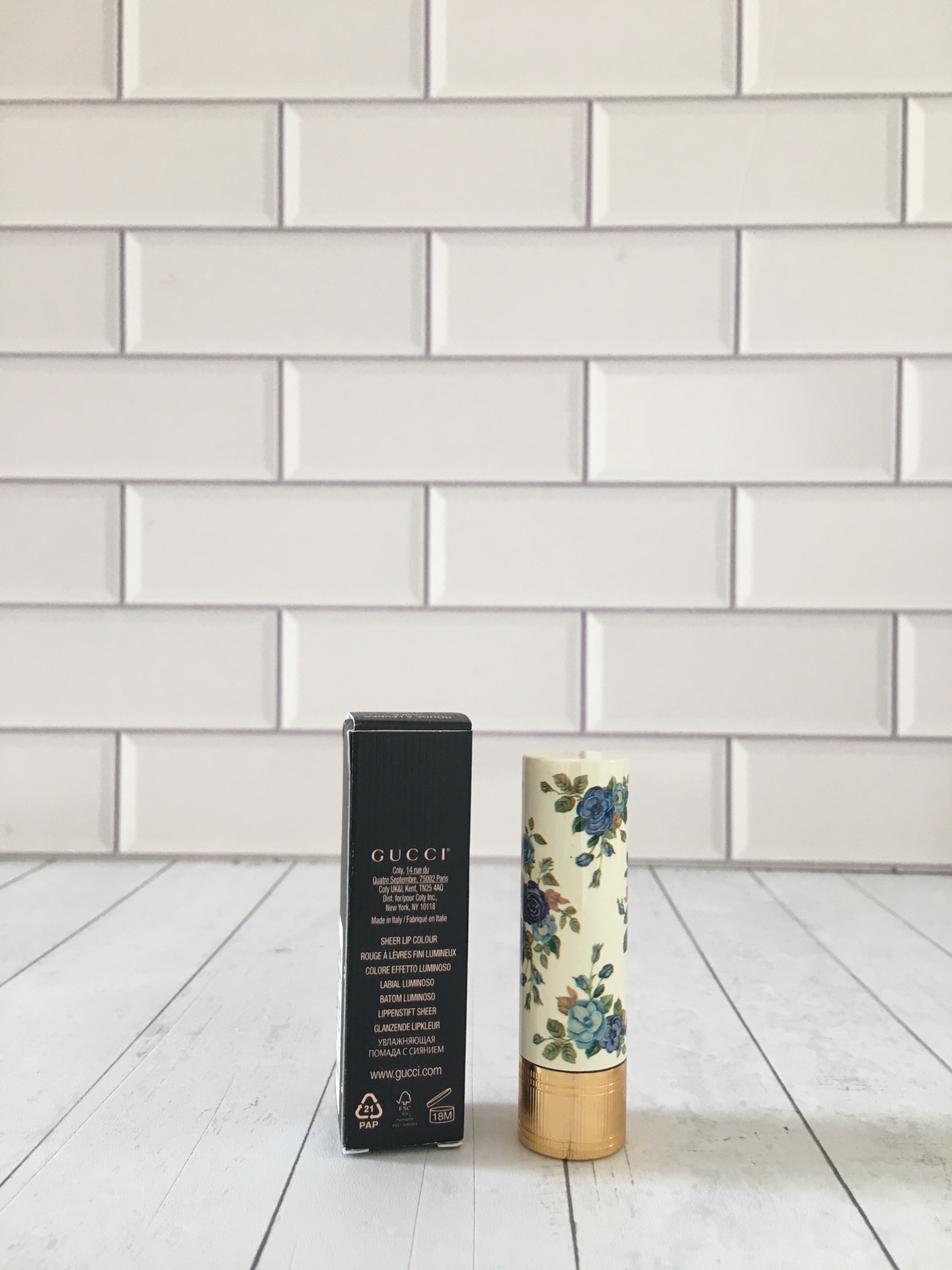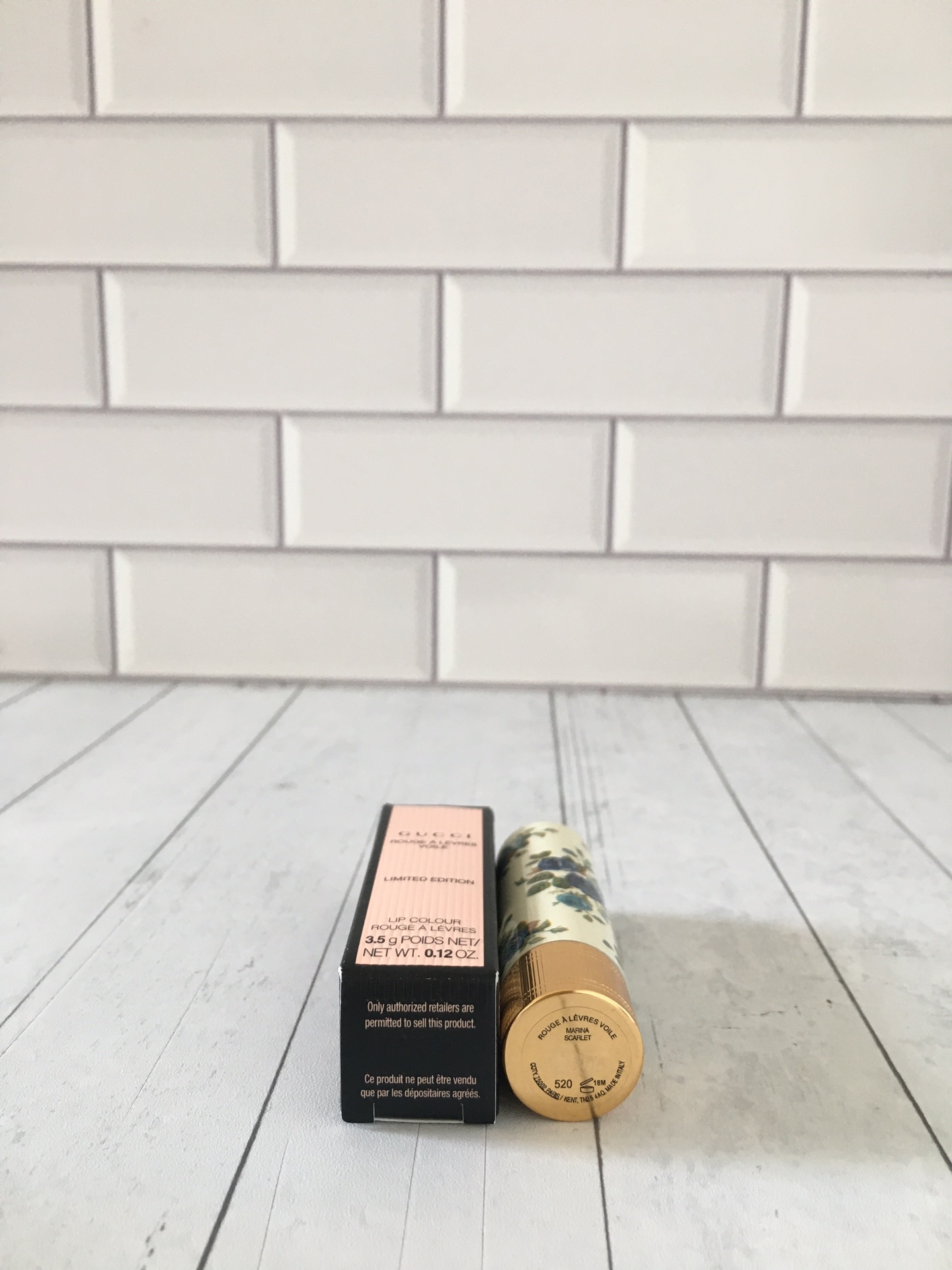 Indulge in Gucci's limited edition lipstick featuring a vintage blue floral design. Shade 520 offers a blend of red and brown for everyday wear.
