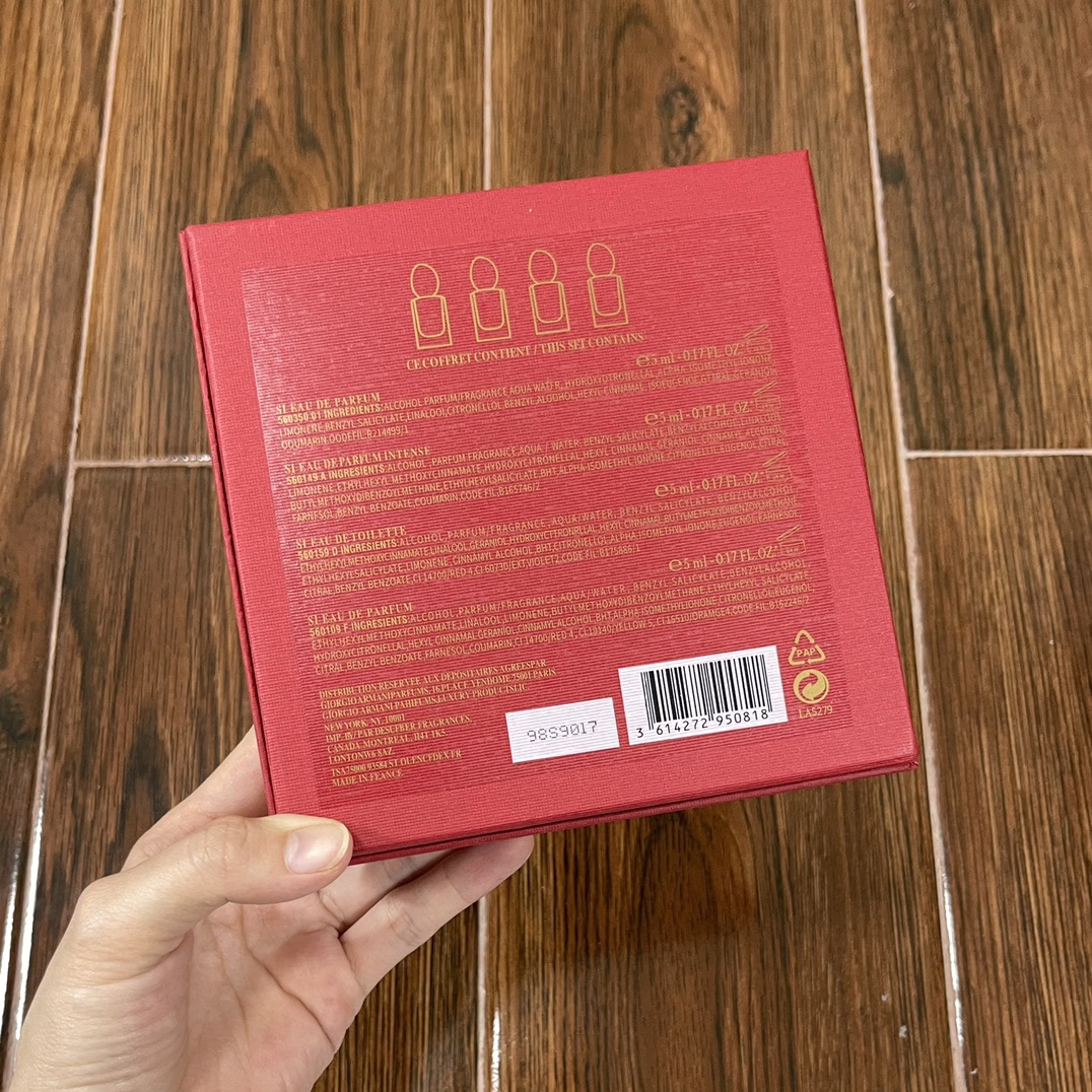 - Set includes: Armani Red, Black, Yellow, and Pink miniature perfumes.