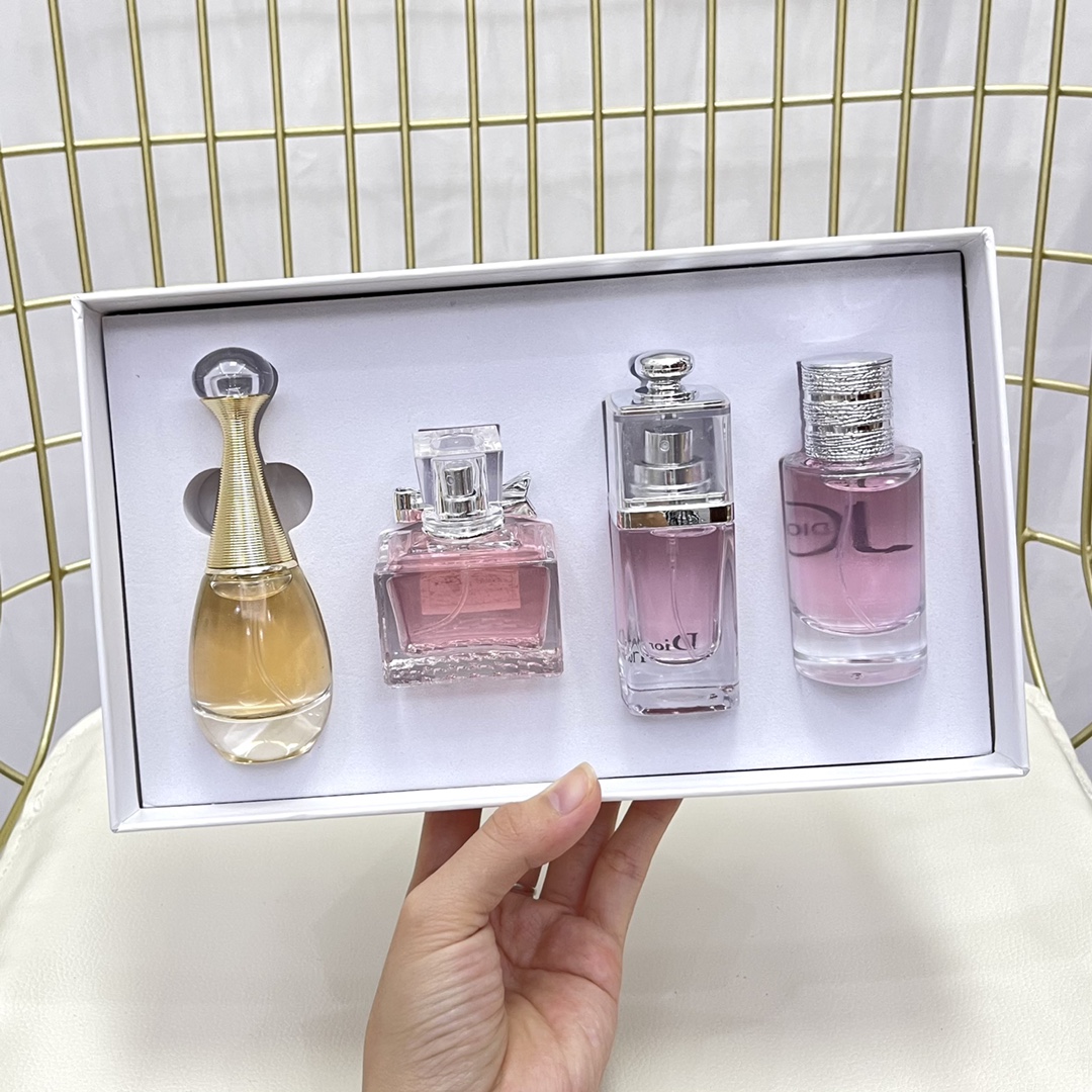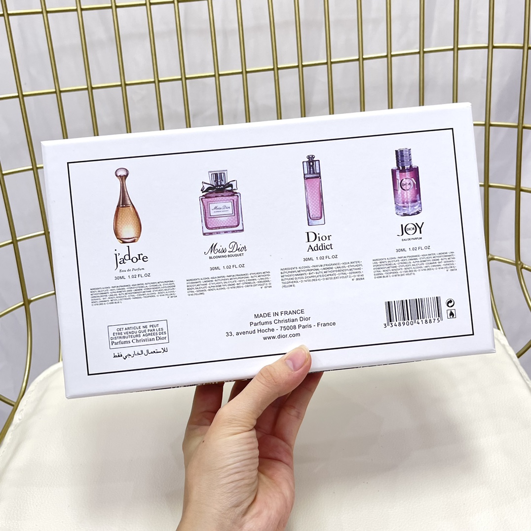 - Set Includes: J'adore, Miss Dior, Addict, Joy