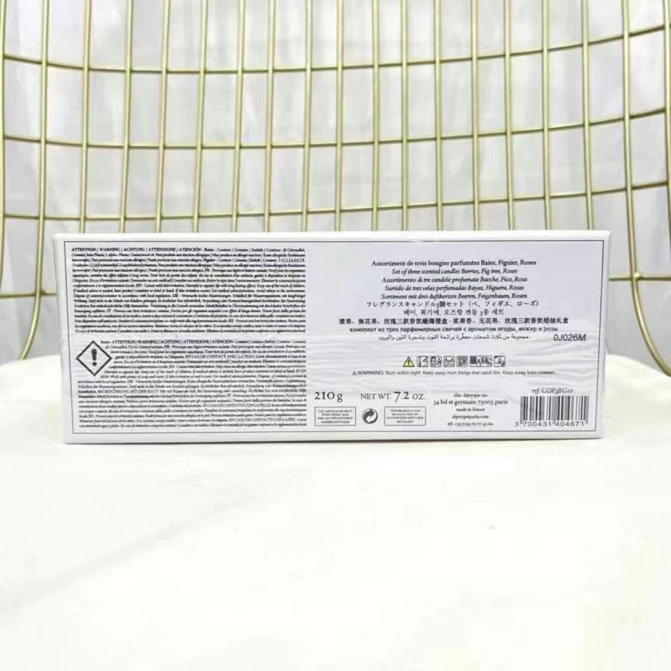 Experience the luxury of Diptyque with this exquisite scented candle set.This set includes three 70g candles: Rose, Berry, and Fig.