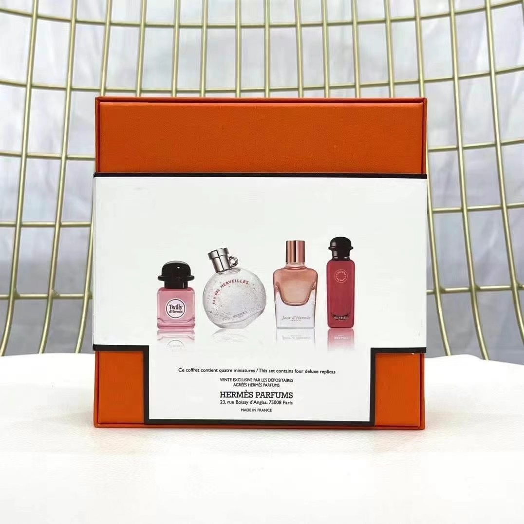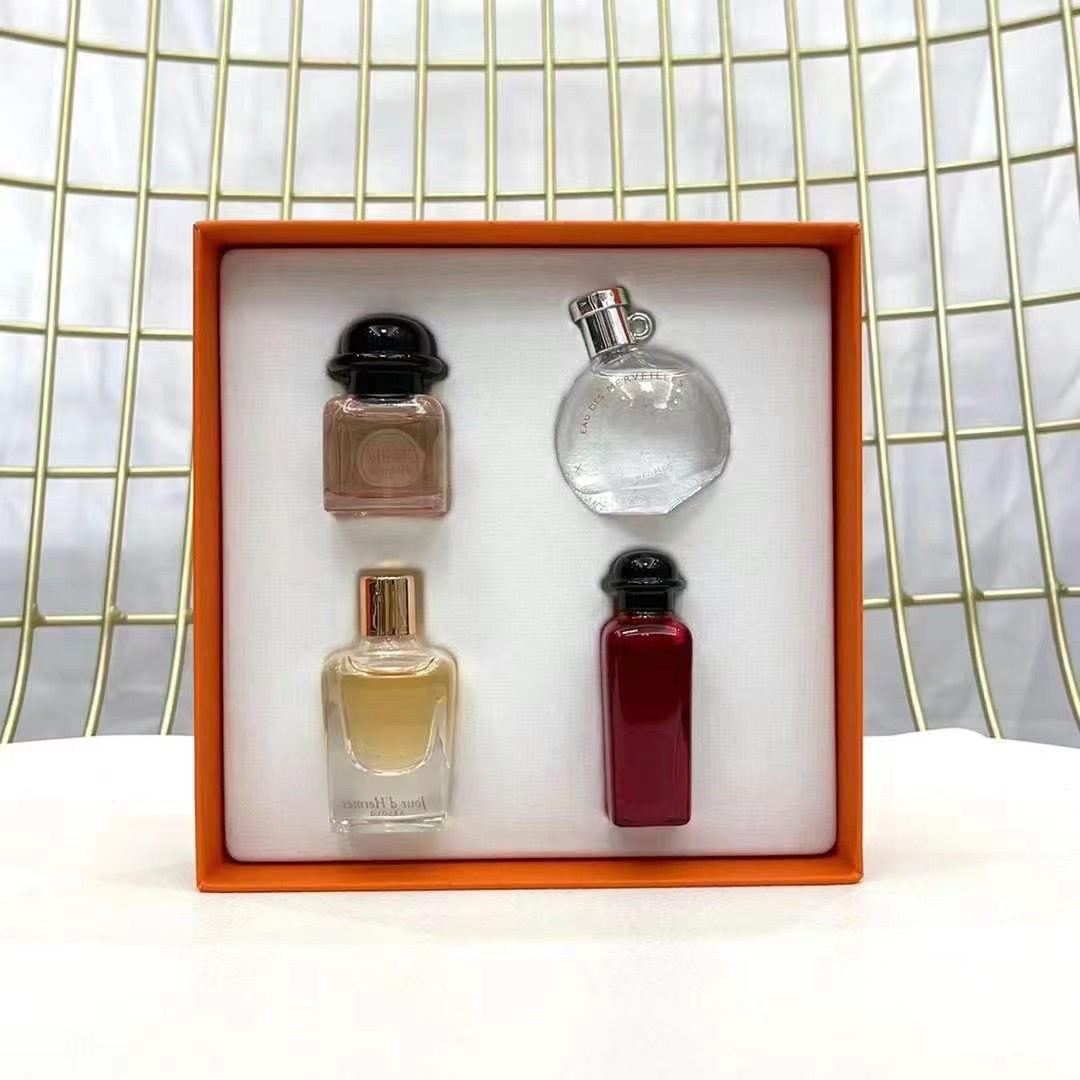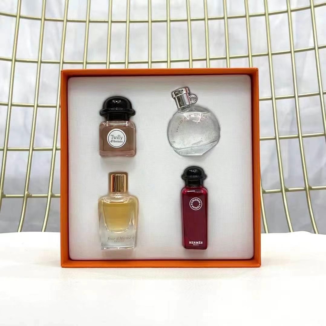 Discover four iconic Hermes fragrances in a charming miniature set. Perfect for sampling or gifting, each scent offers a unique olfactory experience.